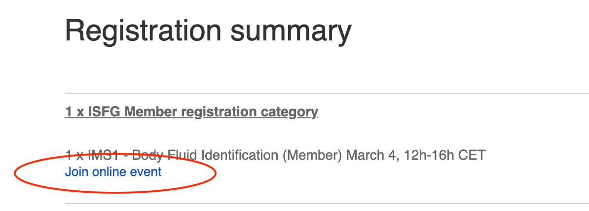 1. After the registration period is over, you will receive a new email confirmation, similar to the email confirmation you received when you registered for the IMS. In this new email, in “Registration Summary”, you will find the IMS you are registered for which contains a link to the ZOOM session at “Join online event”, as below:
